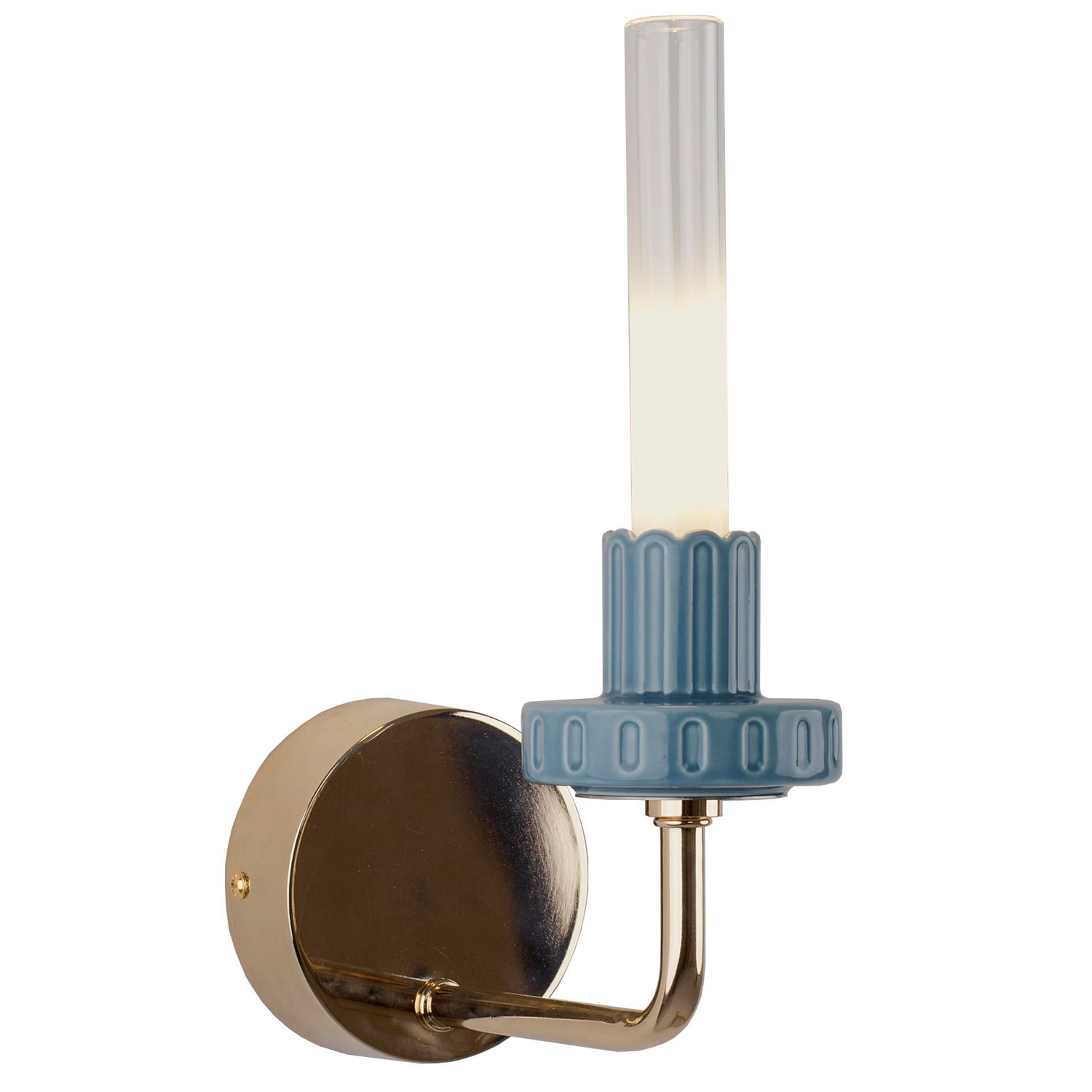 Бра выполнено в дизайнерском стиле и станет стильным акцентом в интерьере. Компактный светильник гармонично сочетает утончённый дизайн и современную эстетику. Корпус выполнен из прочного металла с благородным золотым покрытием. Внимание привлекает декоративный голубой элемент из керамики с рельефной текстурой, добавляющий выразительность и индивидуальность. Прозрачный стеклянный плафон цилиндрической формы придаёт лёгкость общей конструкции. Светильник оснащён LED-лампой мощностью 2 Вт с тёплым свечением, направленным вверх, создающим мягкую, уютную атмосферу. Крепится на планку, выключатель расположен на стене. Уровень защиты IP20 делает бра подходящим для сухих помещений. Прекрасный выбор для оформления спальни, гостиной, прихожей, детской комнаты, а также кафе, гостиниц и загородных домов.