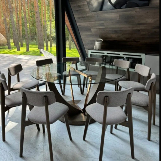● Металлическое основание цвета розового золота — обеспечивает устойчивость и долговечность, дополняя обеденный стол в современном стиле.