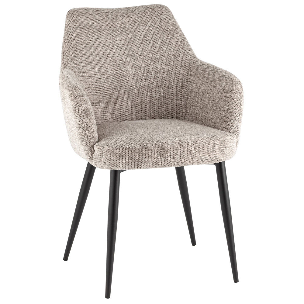 Обеденный стул Katys — это гармоничное сочетание лаконичного дизайна и домашнего уюта. Округлая форма спинки с мягкими подлокотниками создаёт ощущение защищённости и комфорта, а цвет капучино с текстурой "ёлочка" добавляет интерьеру лёгкости и эстетичности. Стул одинаково эффектно смотрится как поодиночке, так и в составе обеденной группы. Обивка выполнена из рогожки — плотной и износостойкой ткани, устойчивой к истиранию и деформации. Материал приятен на ощупь, не выцветает со временем и легко очищается — достаточно сухой чистки пылесосом или мягкой щёткой. Эргономичная форма спинки и сиденья обеспечивает комфортную посадку, а прочная конструкция выдерживает нагрузку до 120 кг. Чёрные металлические ножки придают модели визуальную лёгкость и уверенную устойчивость. Подпятники на ножках предотвращают скольжение и защищают напольное покрытие от повреждений. Katys легко впишется в современные интерьеры кухни, столовой, гостиной, а также станет удачным решением для обстановки кафе или небольшого ресторана. Универсальный и практичный выбор для тех, кто ценит стиль, удобство и долговечность.
