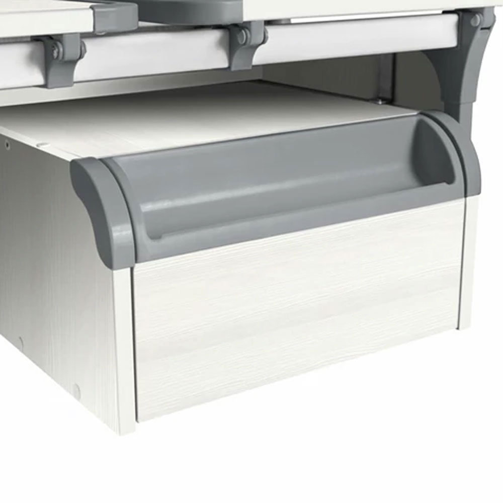 Выдвижной пенал со специальными отделениями для канцелярских мелочей, помогает содержать рабочее место в порядке. Отсутствует пластиковая ручка на фасаде, а выдвижной ящик со скрытыми направляющими открывается с помощью функции «Push to open». Тумба компактна и удобна.